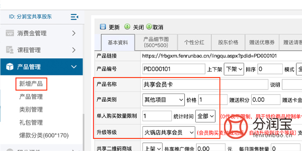然后设置一元链接,在产品管理内,新增产品,填写“产品名称”,选择“产品类别”,填写“产品价格”,填写“单人购买数量”,选择“升级等级”,更新。