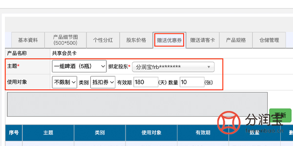 产品及产品价格设置完成后,赠送优惠券,选择“主题”,选择“绑定股东”(即赠送人可以是平台主账号的股东),选择“使用对象”,选择“类别”,填写“有效期数”,填写“数量”,添加。这些都设置完成之后,顾客在手机端花1元,就能直接升级成为火锅店共享会员,享受共享股东权益。
