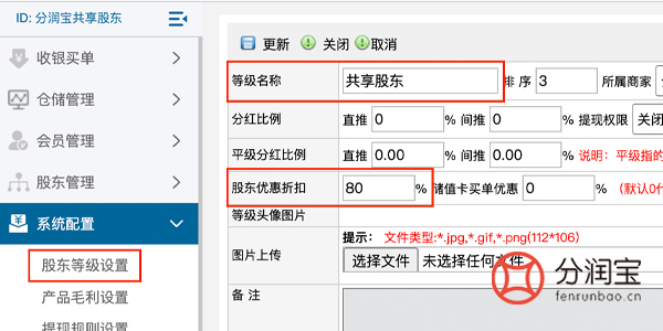 先设置股东等级,在系统配置内选择“股东等级设置”,填写“等级名称”,填写“股东优惠折扣”,更新。共享股东等级可以设置得不一样,不同的等级享受的股东优惠折扣不一样。