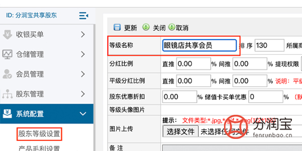 首先设置股东等级,进入共享店铺系统后台,找到系统配置,添加,填写“等级名称”,更新。股东等级可以更加实际情况设置多个,不同的股东可以享受不同的分红权益。