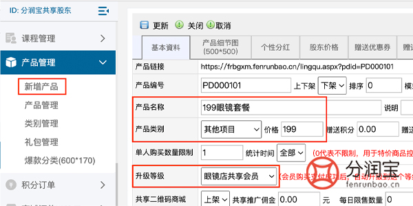 然后设置购买链接,在产品管理内新增产品,填写“产品名称”,选择“产品类别”,填写“价格”,选择“升级等级”,更新。