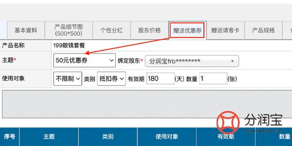 设置赠送优惠券,也就是顾客可以自己使用的。选择“主题”(贵宾卡管理>贵宾卡主题内设置),绑定股东(可是是平台总会员),使用对象选择不限制,选择“类别”,填写“有效期”,填写“数量”,添加。