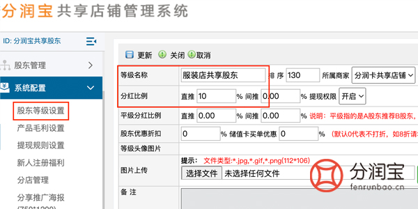 在共享店铺系统中找到系统配置,股东等级设置,添加,填写“等级名称”,填写“分红比例”,更新。