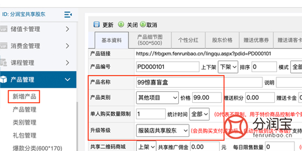 然后上架盲盒产品,在产品管理中,新增产品,填写“产品名称”,选择“产品类别”,填写“价格”,限制单人购买数量,选择“升级等级”,更新。顾客在店里扫码进入共享店铺商城,手机端支付成功,就能成为服装店共享股东了,享受共享股东权益。