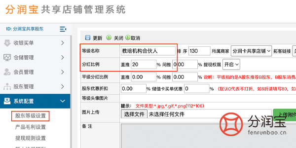 在共享店铺系统后台,找到系统配置,股东等级设置,填写“等级名称”,填写“分红比例”,更新。