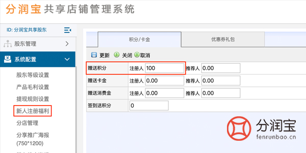 在共享店铺系统中,找到系统配置,新人注册福利,填写“赠送积分”。当然可以按门店实际情况填写积分数额。顾客通过门店二维码,扫码注册就能直接获得100积分了。