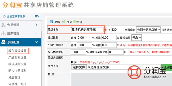 在共享店铺系统后台先设置共享股东等级,在系统配置,股东等级设置中,添加,填写“等级名称”,更新。