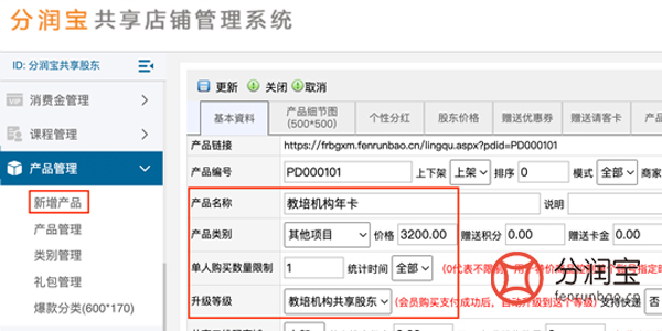 然后在产品管理内添加年卡购买信息,只要顾客在手机端购买成功,直接享受教培机构共享股东权益。产品管理,添加,填写“产品名称”,选择“产品类别”,填写“价格”,选择“升级等级”,更新。