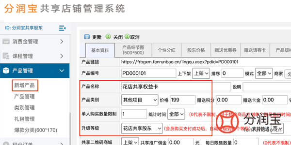 在产品管理中,新增产品,添加,填写“产品名称”,填写“产品类别”,填写“价格”,选择“升级等级”,更新。顾客在手机端购买不同价格商品 ,就能直接升级到不同等级的的会员股东了。