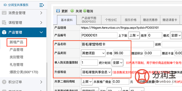老顾客进馆,告知老顾客先在共享店铺手机端,购买99元羽毛球馆特权卡,享受羽毛球馆共享权益。也就是在共享店铺系统后台设置好产品链接,产品管理,新增产品,添加,填写“产品名称”,选择“产品类别”(在产品管理>类别管理中添加设置),填写“价格”,选择“升级等级”(在系统配置>股东等级中添加设置),更新。