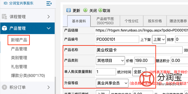 添加“美业权益卡”链接,产品管理,新增产品,填写“产品名称”,选择“产品类别”,填写“价格”,选择“升级等级”,更新。