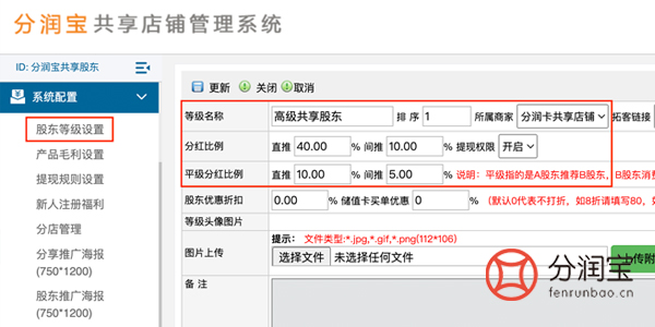 最先开始设置好股东等级,股东的等级名称及直推/间推分红比例,都需要事先规划好。在共享店铺系统后台,找到系统配置>股东等级设置>添加,填写“等级名称”,填写“分红比例”,填写“平级分红比例”,点击“更新”。(注:股东等级的高低是按照排序数字,不会按照添加顺序,设置时需注意,否则会出现升级不上等诸多情况)