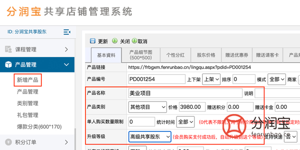 以上图美业项目为例:该高级共享股东所得分红收益为(产品价格*产品毛利*分红比例),也就是3980*20%*40%=318.4。(产品毛利在系统配置>产品毛利设置中添加)