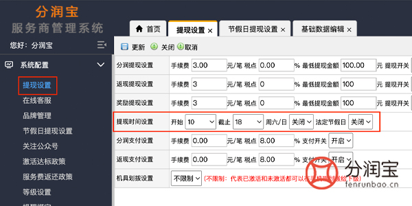 登入支付联盟分润系统后台,找到系统配置>提现设置>提现时间设置,根据公司模式的实际情况,可设置提现的开始时间/结束时间,周六-日开启/关闭提现,法定假日开启/关闭提现。