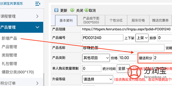 二、消费赠送积分。在产品管理--新增产品,填写“赠送积分”数量,顾客通过链接购买成功,自动活动相应积分。