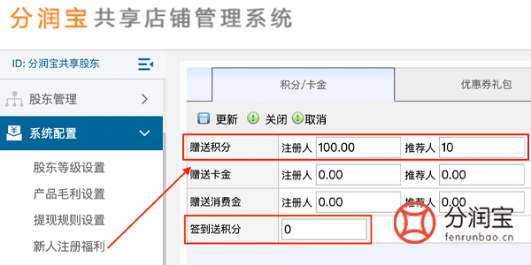一、新人注册/签到赠送积分。在系统配置--新人注册福利,填写“赠送积分”,注册人/推荐人分别赠送多少,填写“签到送积分”。顾客通过扫码或者推广链接注册成功,即可获得赠送的积分,在手机端我的页面,签到也可获得积分。