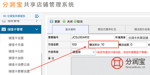 三、充值赠送积分。在储值卡管理--储值卡套餐设置,填写“赠送积分”,顾客在手机端充值成功,即可获得相应积分。
