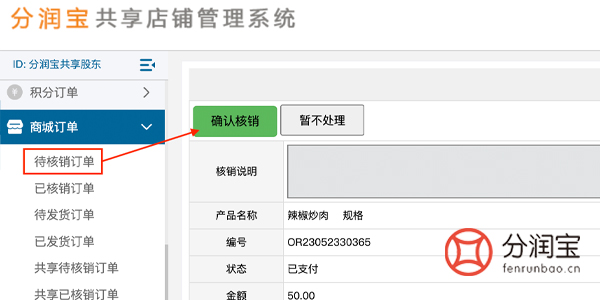 1、门店员工手动核销,在商场订单--待核销订单,选择会员要核销的商品,去核销。核对订单的详细信息,确认核销。