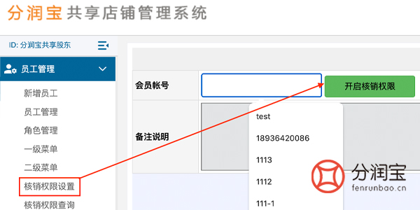 2、门店员工扫码核销,在员工管理--核销权限设置,输入“会员账号”,开启核销权限。顾客到店出示共享店铺系统手机端商品核销码,门店核销人员用微信扫一扫即可核销成功。