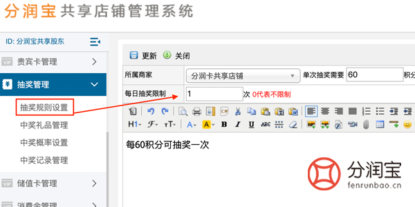 积分参与大转盘抽奖活动,在抽奖管理--抽奖规则设置,也就是多少积分可以抽一次,每人每天抽奖限制的次数设置。