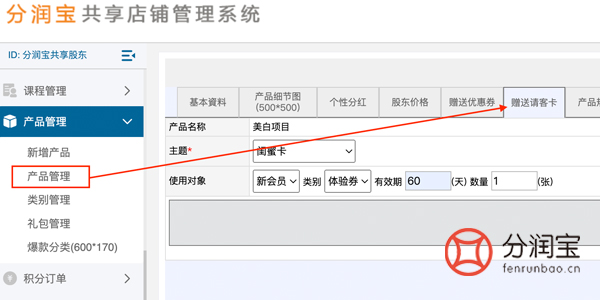 在产品管理中设置赠送请客卡,选择“主题”,选择“使用对象”,选择“类别”,填写“有效期”,填写“数量”,添加。
