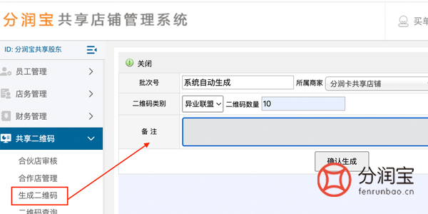 操作其实很简单,登入共享店铺系统,找到共享二维码--生成二维码,选择“所属商家”,选择“二维码类别”,填写“二维码数量”,确认生成。