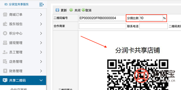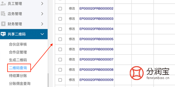 生成成功之后,在二维码查询中就能看到刚刚生成的二维码列表,点击修改进去,将里面的二维码发个合作商家,填写相关信息(注:每个二维码对应一个商家),可以按商家门店不同,设置不同的分佣金额。