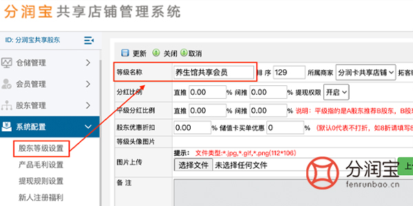 高总在共享店铺系统后台,设置了共享会员的股东等级,只要是共享会员的顾客都可以享受优惠100元。在系统配置--股东等级设置,添加,填写“等级名称”,按需填写分红比例、股东折扣等,更新。