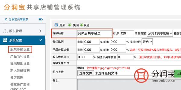 其中大礼包项目,都可以通过共享店铺系统后台设置。在系统配置中,找到股东等级设置,如图所示,填写“等级名称”,更新。