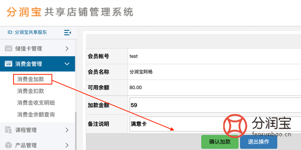 共享店铺系统中消费金的使用都可以直接加款或抵扣,不用纸质记录。找到消费金管理--消费金加款,核对共享会员信息,填写“加款金额”,填写“备注说明”,确认加款。消费金扣款操作步骤也是一样,关于消费金的收支明细,余额等都可以通过后台查询相关数据。