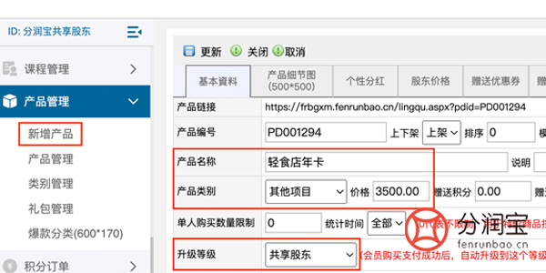 轻食店小程序的商品上架、积分、储值等相关活动,都可以通过在共享店铺系统后台设置。在产品管理中,新增产品,填写“产品名称”,选择“产品类别”(需先在类别管理中添加),填写“价格”,选择“升级等级”,更新。