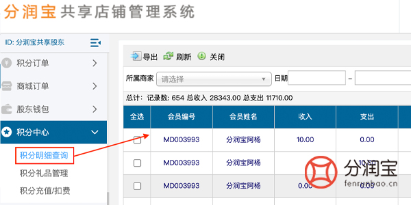 后台的积分中心,积分明细查询、积分礼品管理、积分充值/扣费,都可以查询到详细的会员姓名/收入/支出/类别/时间等。