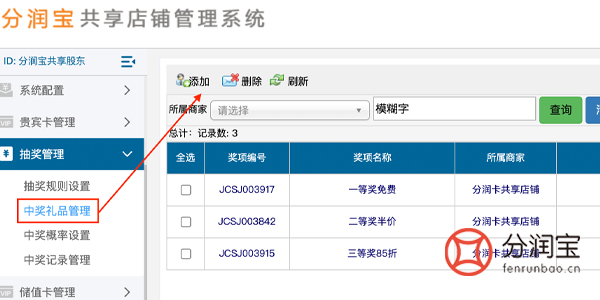然后在抽奖管理中,添加,中奖礼品。抽奖的规则可以自定义,多少积分可抽奖。中奖概率也能设置,按照排列顺序,数字对应的是什么奖品就是什么奖品。中奖记录等在后台都有详细记录,随时方便查询。