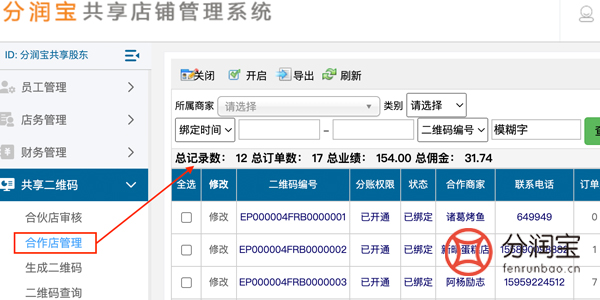 通过共享店铺系统后台可以查询,合作门店名称、联系电话、订单数量、总业绩、总佣金等相关数据。