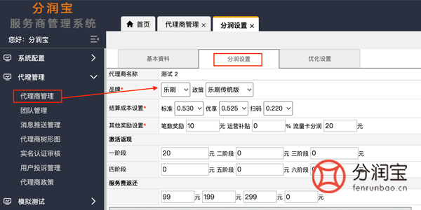 代理商分润设置,找到代理管理--代理商管理,填写代理的基本信息之后,选择分润设置,选择“品牌”,选择“政策”,选择“结算价成本”(在系统配置>结算价成本中设置,上级代理可设置下级代理的结算成本价,得到其中的分润差价),填写“其他奖励设置”笔数奖励、流量卡分润等。