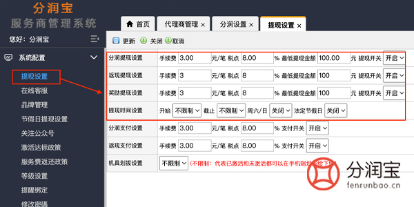 分润提现设置,找到系统配置--提现设置,可以根据实际情况设置提现手续费、税点、最低提现金额、提现时间等。