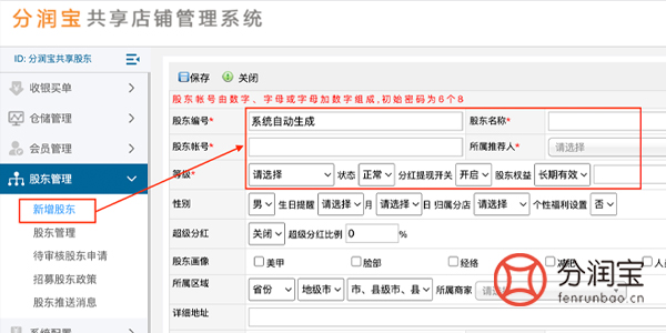 登入共享店铺系统,找到股东管理,新增股东,填写“股东名称”,“股东账号”,选择“所属推荐人”(选择平台),“等级”(需先在系统配置>股东等级中设置),保存。
