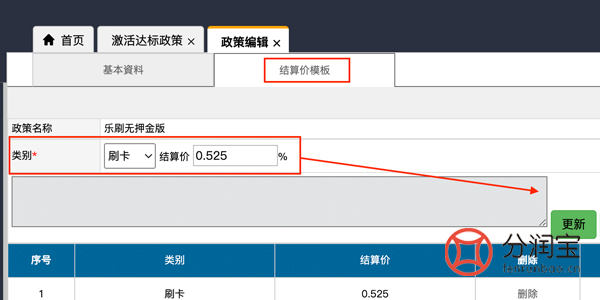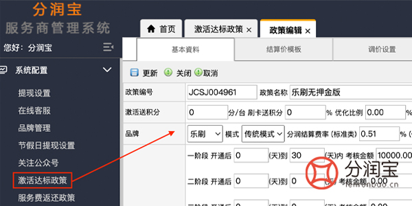 支付联盟系统后台,在系统配置,“激活达标政策”中,设置政策名称、品牌、分润结算费率、达标设置等。