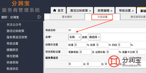 等级设置成功之后,选择分润设置,根据品牌、政策、设置结算价、其他奖励及服务费返还金额等。