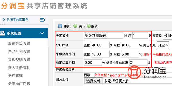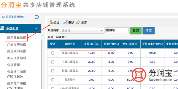 在共享店铺系统中按照等级名称的不同,设置不同的分红比例(直推/间推分红比例、股东优惠折扣、储值卡买单优惠)等,如图所示。