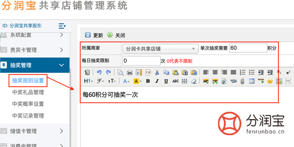 然后在抽奖管理中设置抽奖规则,“单次抽奖所需积分”,“每日抽奖限制”,相关的备注说明,更新。