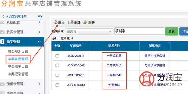 中奖礼品管理中设置具体的奖品,可设置6个,系统会根据中奖概率中的设置,按照排序,依次决定顾客的中奖礼品。