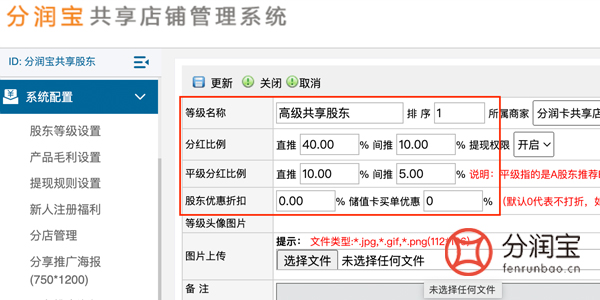 设置股东会员的分红比例(直推/间推),平级分红比例(直推/间推),股东优惠折扣(此等级下的股东购买项目/商品享受的优惠折扣价),储值卡买单优惠(通过手机端充值页面充值成功之后,用储值卡买单享受的优惠)。