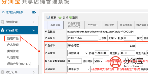 上架产品,在产品管理中,新增产品,填写“产品名称”、“价格”,选择“产品类别”、“升级等级”。也就是顾客在手机端能直接购买商品,成为某个等级的股东,享受股东权益。如果推荐好友购买成功享受好友消费的分红收益,这些分红收益都是源源不断的。