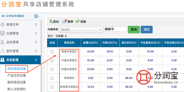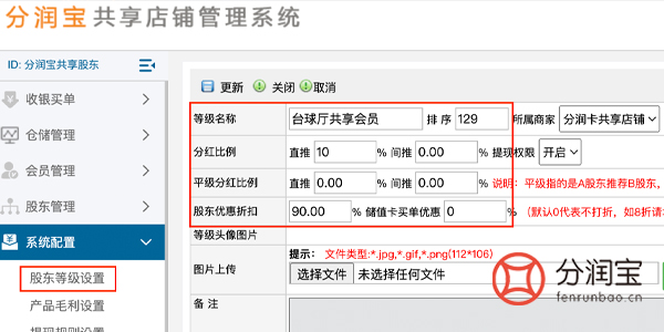 在共享店铺系统后台设置股东等级,找到系统配置,股东等级设置,填写“等级名称”、“分红比例”、“股东优惠折扣”,更新。