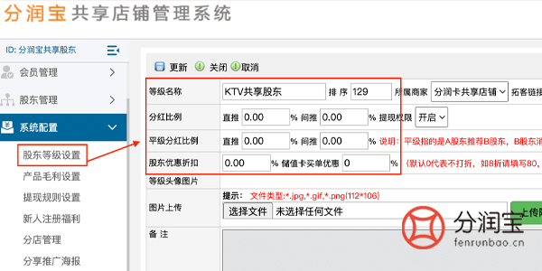 系统配置,股东等级设置,填写“等级名称”(KTV共享股东)、分红比例、股东优惠折扣、储值卡买单优惠,更新。