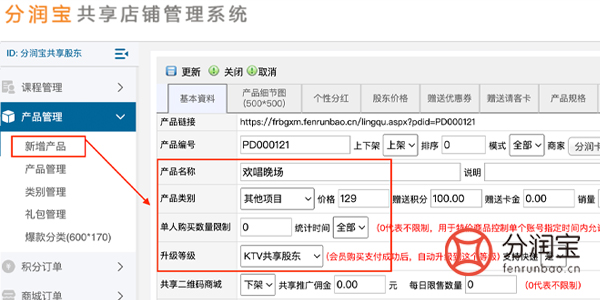 然后在新增产品中,填写“产品名称”(根据KTV的命名规则来命名)、“价格”,选择“产品类别”、“升级等级”,更新。