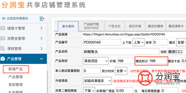 在共享店铺系统中,上架商品时,填写产品的相关信息之后,在赠送积分的位置,按照门店定制的积分比例,填写好赠送积分的数额(如图所示)。顾客在共享店铺商场购买成功,将自动获得积分。