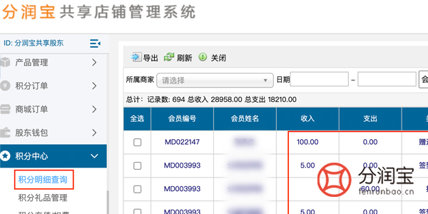 查询积分余额:顾客可以在账户信息或个人中心中查看积分余额,了解目前所持有的积分数量。门店通过共享店铺系统后台也能详细查看共享股东的积分使用明细。(如图所示)