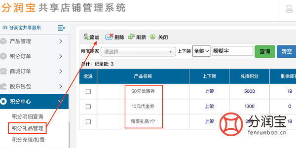 在积分中心,积分礼品管理,按需添加积分兑换礼品,顾客在手机端,可用自己获得的积分直接兑换自己想要的商品。
